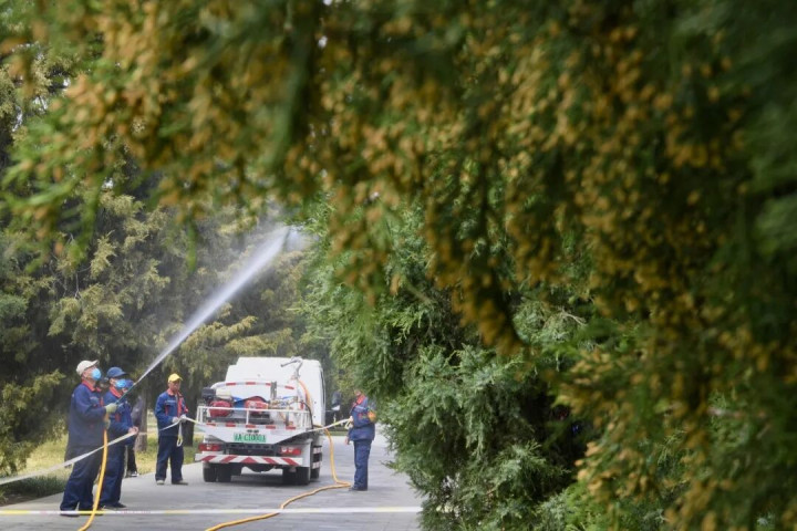 △北京天坛公园的园林工东谈主通过喷水功课缩短花粉浓度。(贵寓图)
