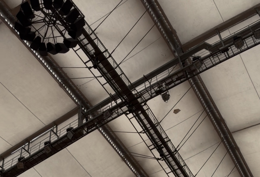 在场馆上空,纸飞机造成一个不起眼的白点。 记者 摄
