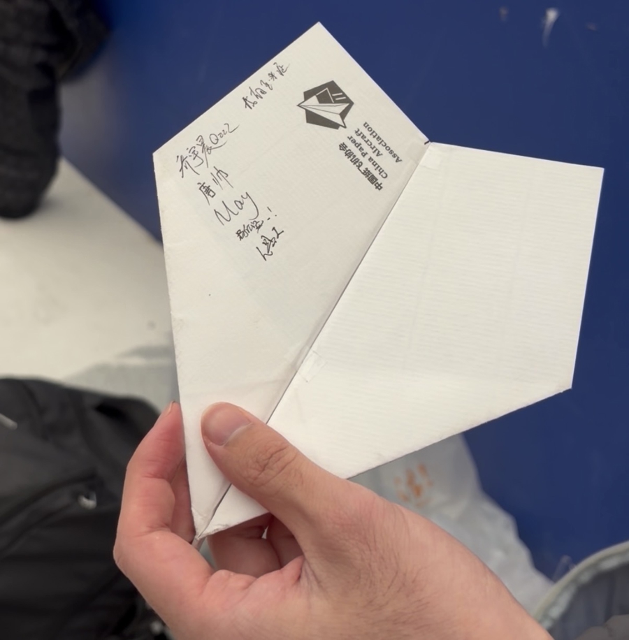 纸飞机用了英国的水纹纸,上头是少年们的签名。 记者 摄