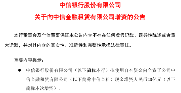 本次增资完成后,中信金租注册本钱将由100亿元加多至120亿元,中信银行仍执有中信金租100%股权。