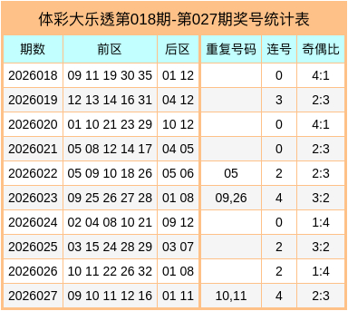 体彩大乐透第26027期奖号为:09、10、11、12、16 + 01、11,前区奇偶比为2:3,连码开出09,10,11,12,重号开出10,11。