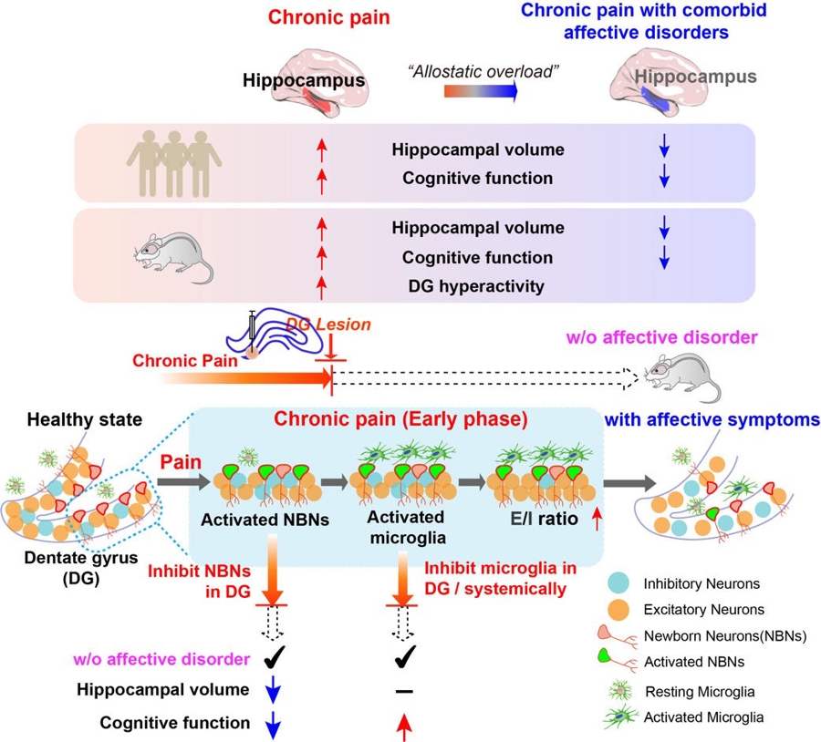 海马则是这一“情谊闸门”的中枢关键。东谈主群影像数据自大:疾苦早期,海马体积少顷增大,功能情状增强。疾苦抓续并随同抑郁后,海马慢慢萎缩,调控智商下落。海马中的齿状回(dentate gyrus, DG)是“情谊闸门”的关键节点。DG是成年大脑中少数仍能产生新神经元的区域,平定信息诀别与整合。疾苦早期,DG内腾达神经元及关联信号被激活,证据出符合性可塑性;疾苦督察期,小胶质细胞参与调控,神经环路怡悦—阻碍均衡被冲破,情谊调控慢慢失败。