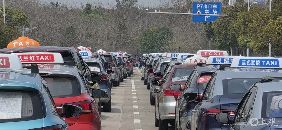 浦东海外机场P7出租车蓄车场前,东远航线上排满了等候入场的出租车。