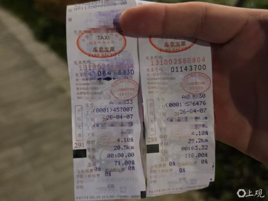 只见司机从车内储物箱掏出一个带屏幕的玄色机器,按了一些按钮后,机器确实印出了一张“发票”,开赴技艺和刚才的正规发票一样,下车技艺晚13分钟,距离从20.5公里变成了29.2公里,总金额变成了110元,车招牌也变成了沪A*30。同期,发票上两个红章一模一样,对记者来说,两张发票一眼辨不出分袂。司机也屡次和记者证实,这张110元的发票一定不错供记者“拿给公司报销”。
