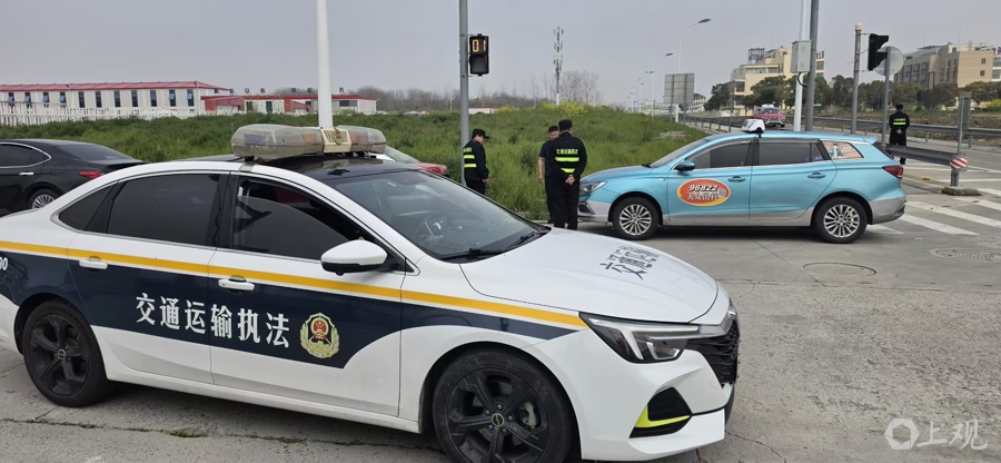 交通运载王法东说念主员正在对违法出租车进行查处。