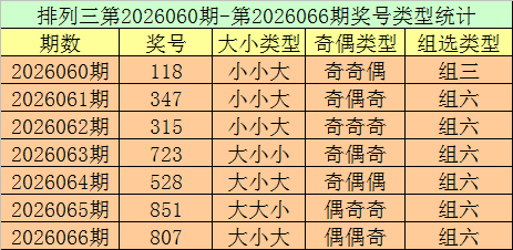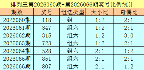 陈设三第2026066期回来:奖号807,奇偶比1:2,大小比2:1,和值15,类型:组六。