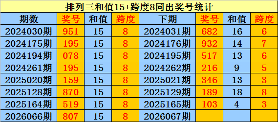 成列三近8次和值15+跨度8同出时奖号为:951、195、078、195、159、870、519、807,下期差异出现:682、932、517、216、346、189、103。