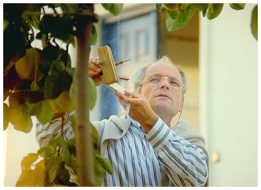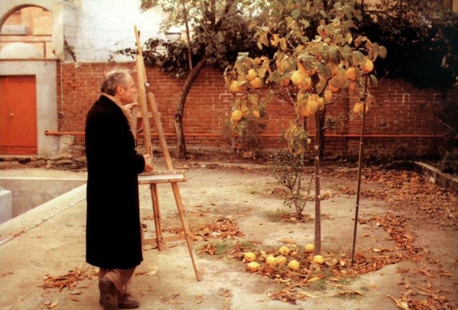 画家用一样的阵势不雅察、形容院子里结满果子的榅桲树。导演记录了加西亚自创的测绘格局,为追求比例精确的写生,他用水平线和铅锤定位树在平面构图中的位置,为了幸免视角偏差,不仅画架的位置是固定的,连画家耸立的地点也要精确到用钉子在大地象征。他在荏苒的时辰里恭候阳光重来,光在变,树也在变,他注视着事物随时辰变化的思绪,在叶子和果子上标注着白色颜色的记号,把这棵树的巧妙变化记载到画布上。